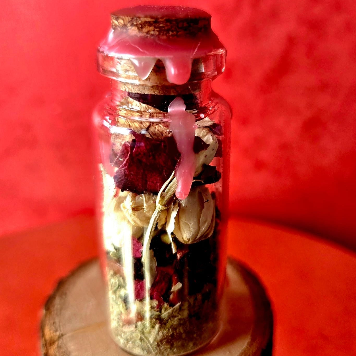 Une Fiole , les 5 ingrédients naturels , une bougie, une capsule à message , une lettre vierge, une coquille Saint Jacques et le mode d'emploi détaillé pour réaliser et activer ta potion magique .