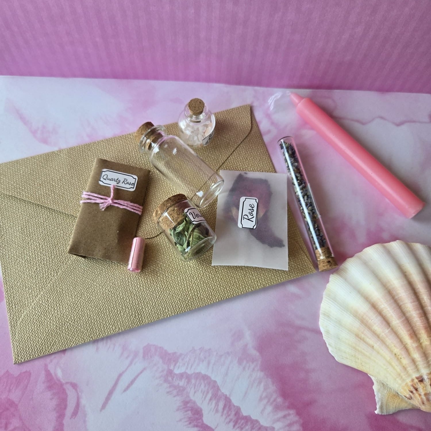 Une Fiole , les 5 ingrédients naturels , une bougie, une capsule à message , une lettre vierge, une coquille Saint Jacques et le mode d'emploi détaillé pour réaliser et activer ta potion magique .